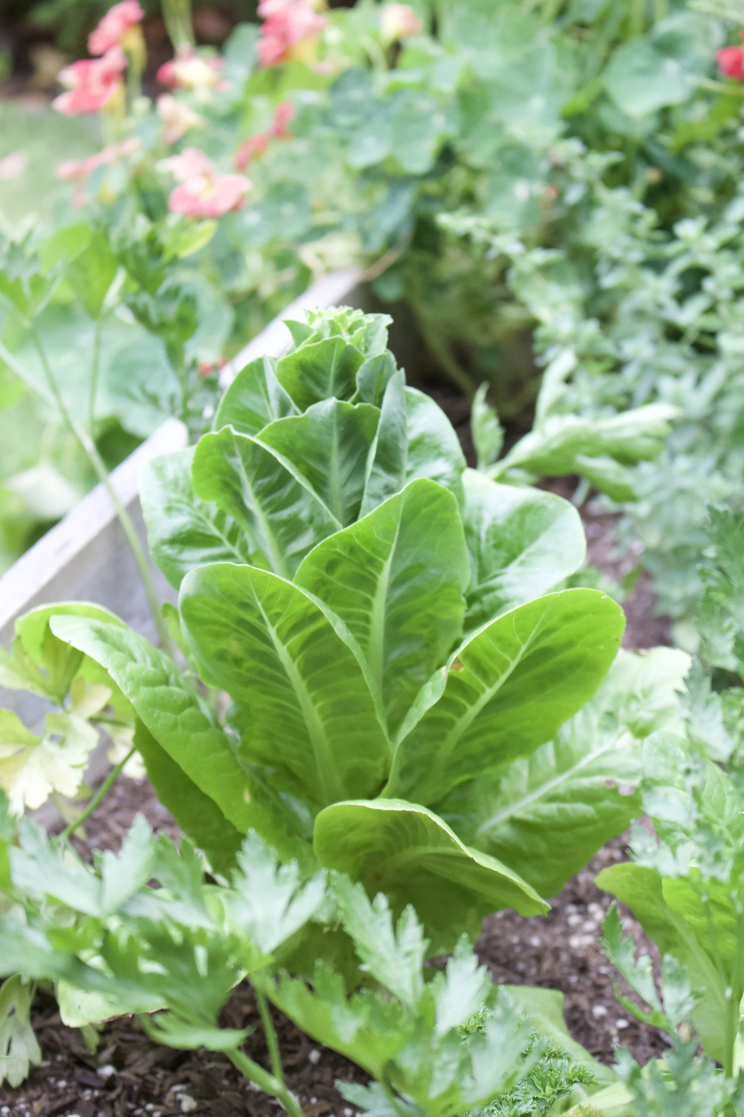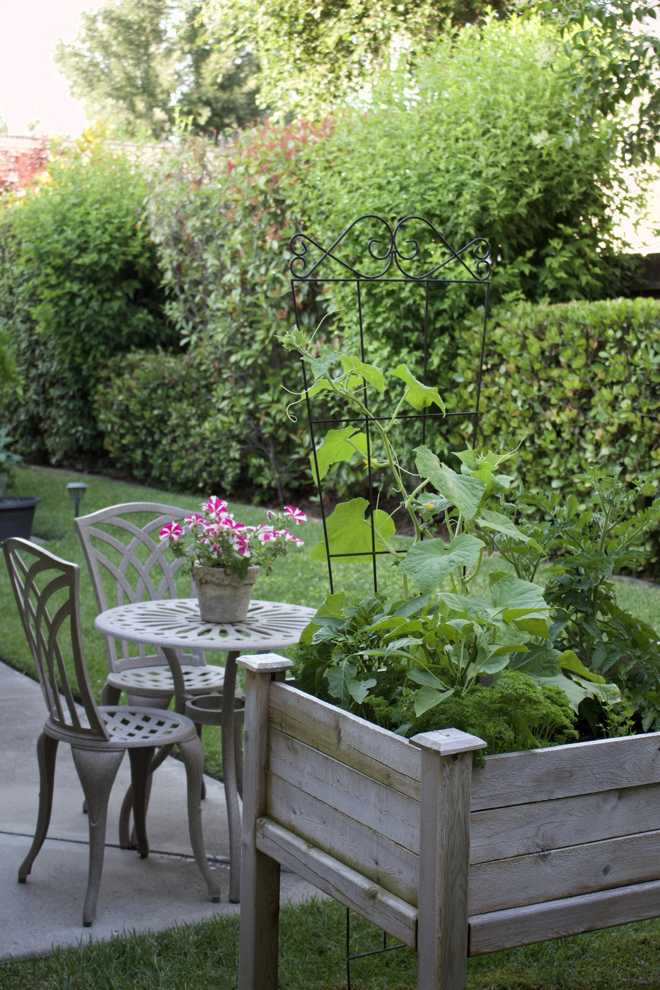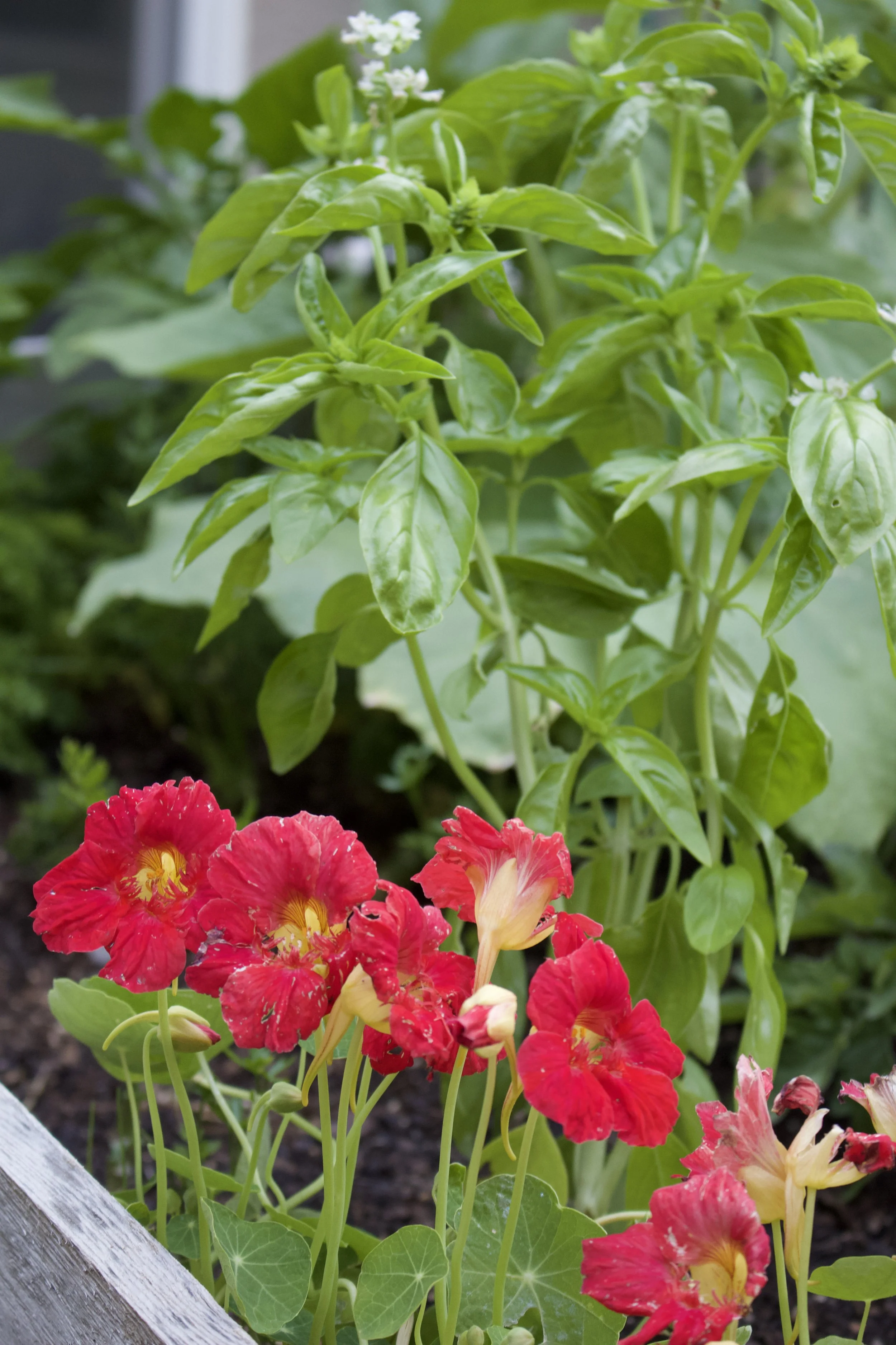 The combination of herbs and vegetables in these small elevated garden beds has proven to be helpful in deterring pests. Nasturtiums and parsley help keep the insects away while basil planted near tomatoes adds to their flavor.